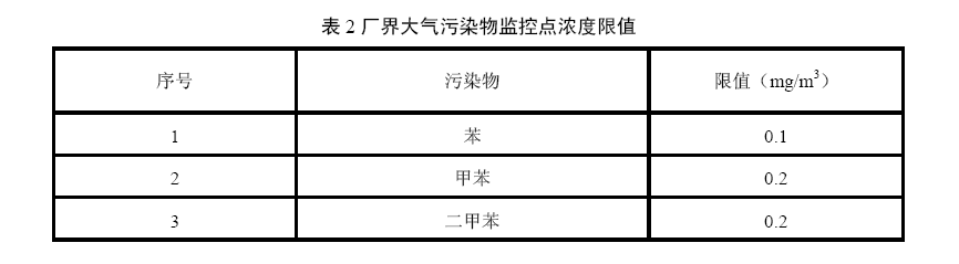 4.2.2廠界大氣污染物監(jiān)控點(diǎn)濃度限值 廠界大氣污染物監(jiān)控點(diǎn)污染物濃度限值應(yīng)符合表2規(guī)定。