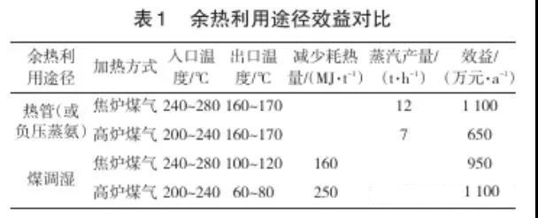 由于焦?fàn)t加熱用煤氣種類的不同,焦?fàn)t煙道廢氣余熱利用的溫度差別很大,以年產(chǎn)120萬t焦炭的焦?fàn)t煙道廢氣利用熱管技術(shù)生產(chǎn)蒸汽(或負(fù)壓蒸氨)和煤調(diào)濕技術(shù)進(jìn)行對(duì)比,對(duì)比結(jié)果見表1。